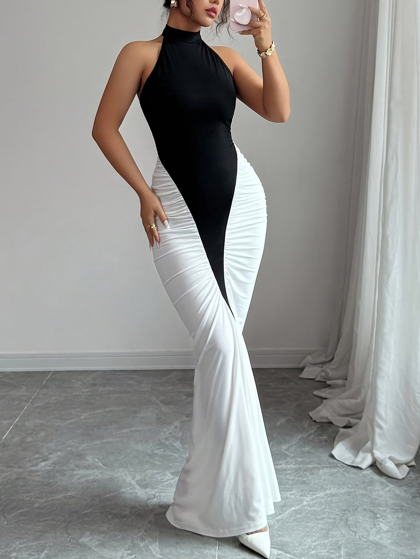 This elegant women's dress features a beautiful black and white solid color and a unique halter neck design. Crafted from a medium-elastic knit fabric (95% polyester, 5% elastane), its bodycon silhouette is complemented by a flowing fishtail hem and a frill detail, making it a stylish and comfortable piece for any occasion.
