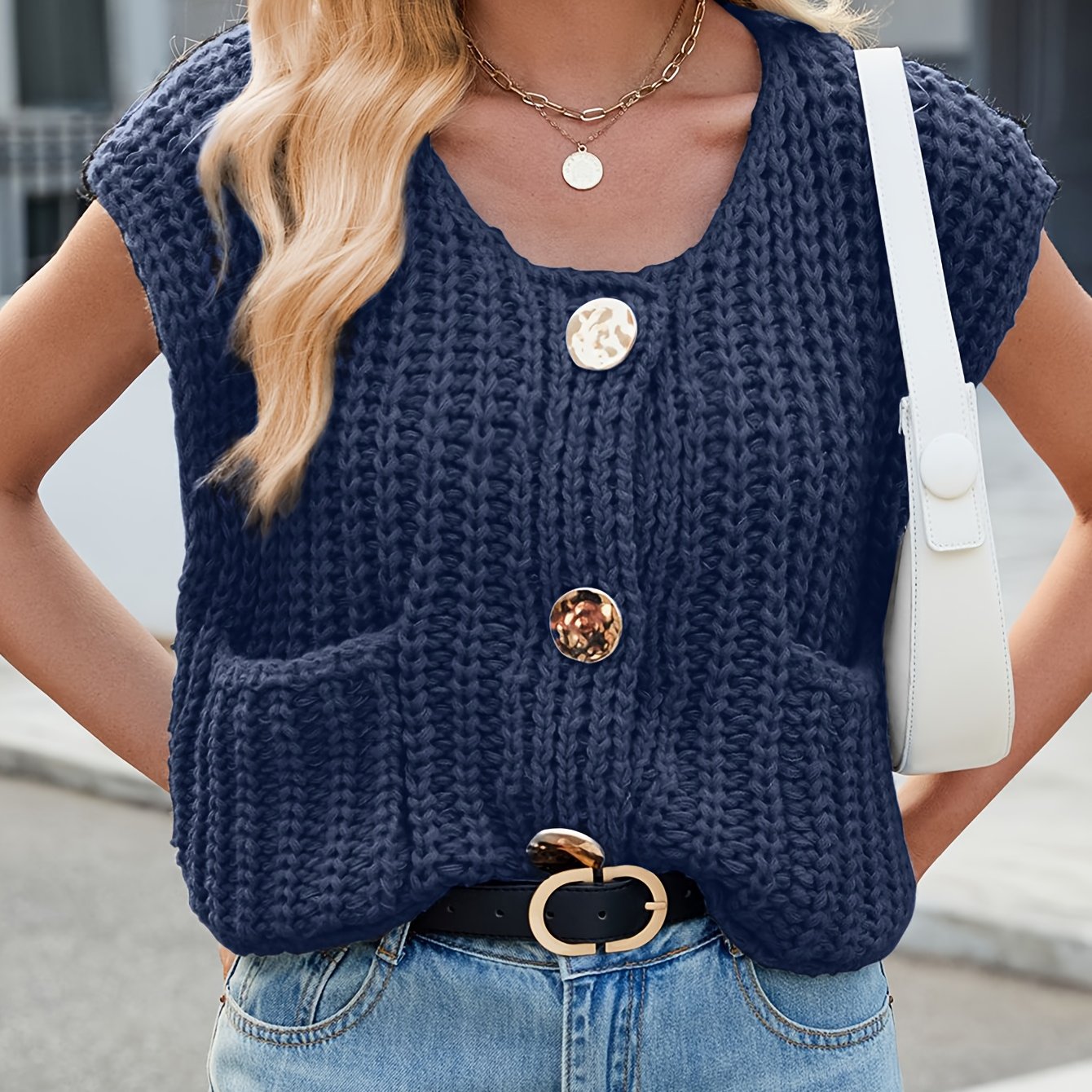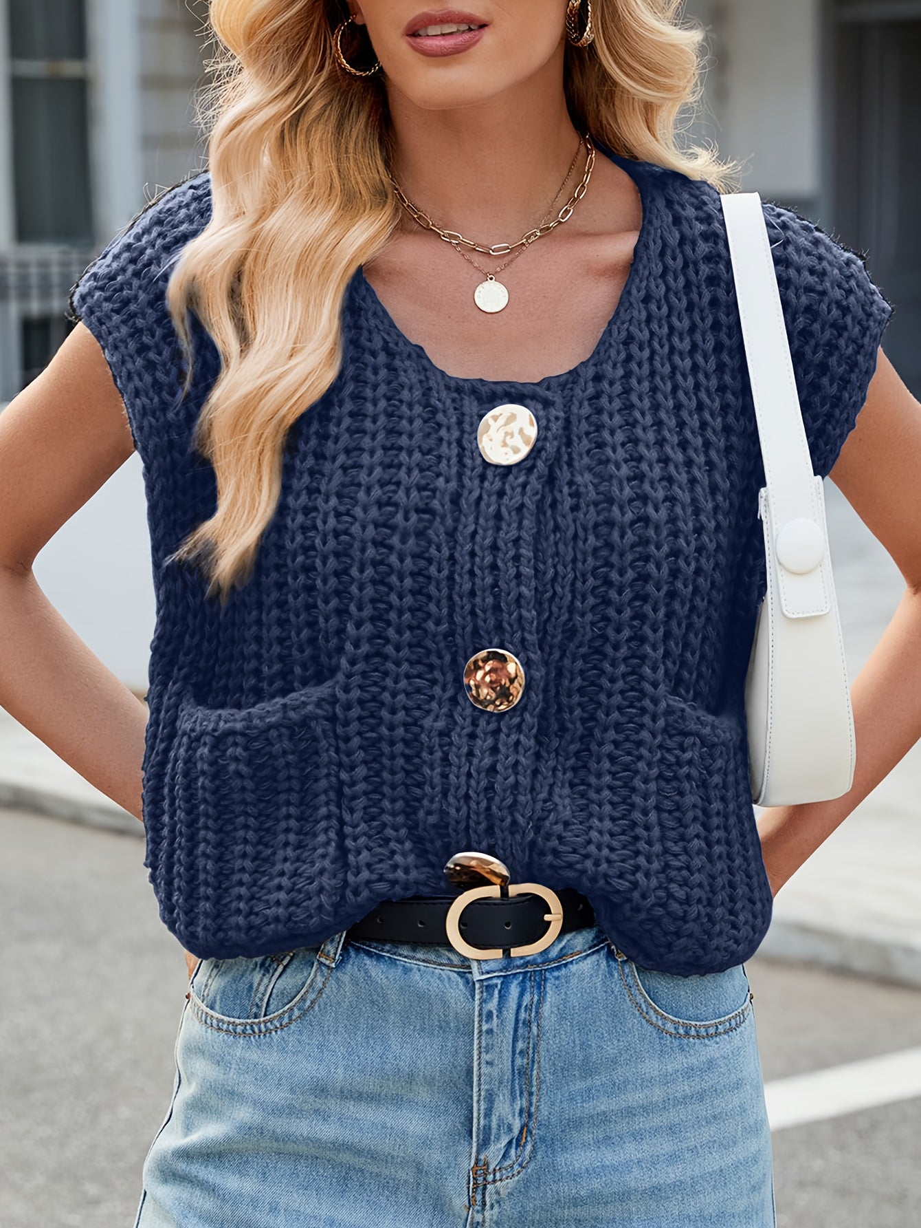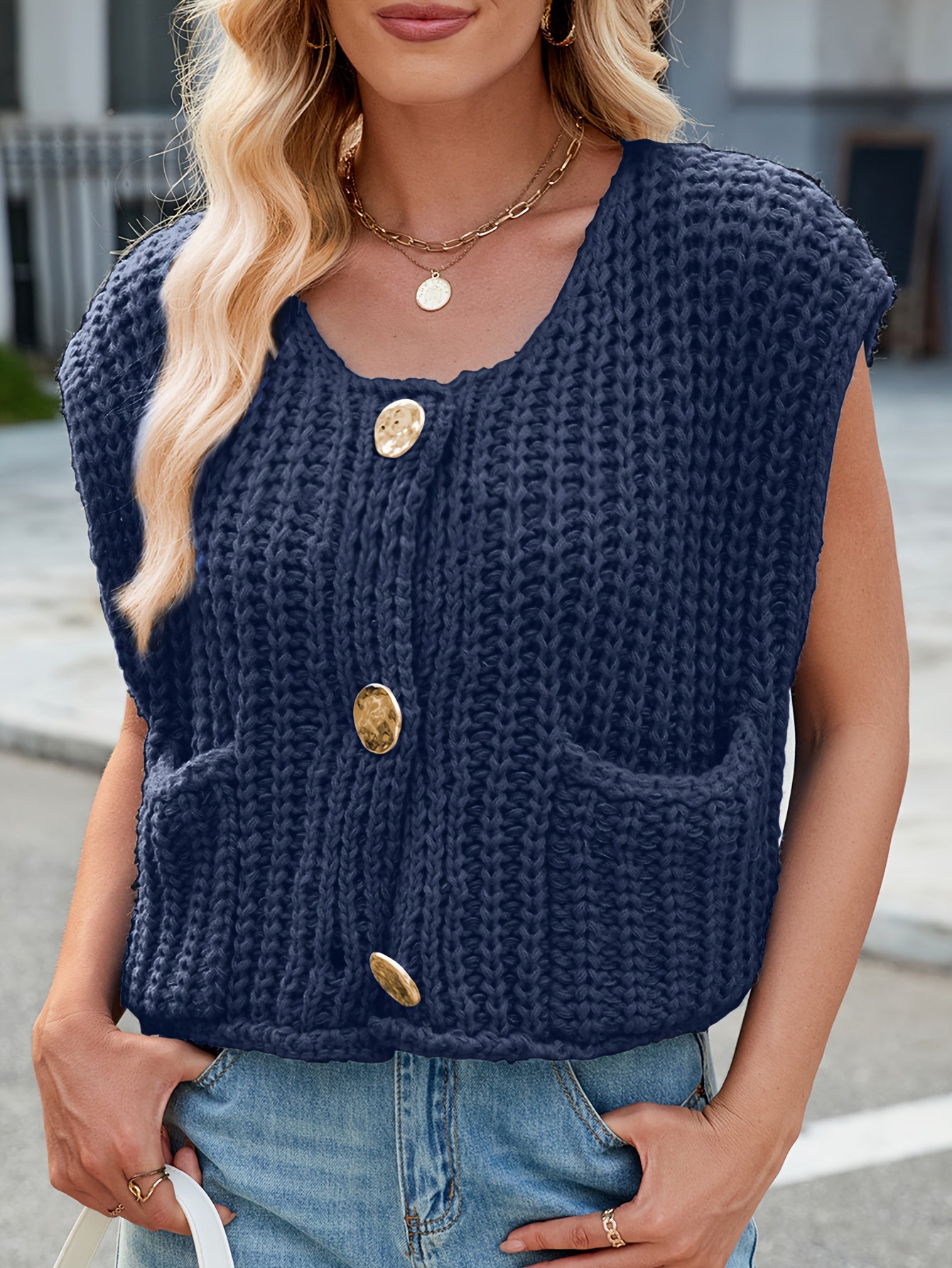 It's designed with a classic crew neck, a stylish button-front placket, and two cute front pockets. The sleeveless design makes it a perfect, versatile piece to throw on over a long-sleeve shirt or blouse for a polished yet casual look, ideal for those crisp fall and winter days or a cool spring evening.